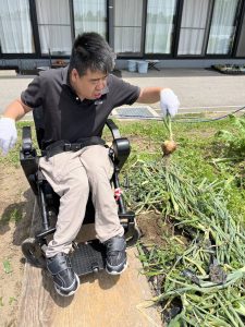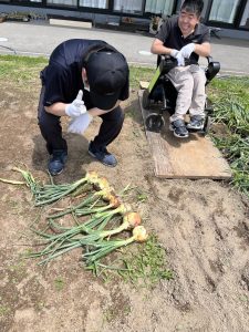 利用者2名が玉ねぎを収穫している姿