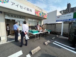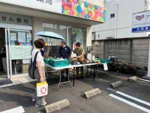 中川区社会福祉協議会とアイセイ薬局さんの合同イベントに出店し、野菜と革製品・エコバックを販売しました。